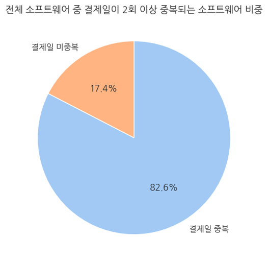 전체 데이터를 비교해봤을 때, 각 기업에서 결제일이 같은 소프트웨어의 수는 2,377개였습니다. 총 소프트웨어 수가 2,879개인 것을 고려하면 대부분의 소프트웨어가 결제일이 같다는 것을 확인할 수 있습니다.