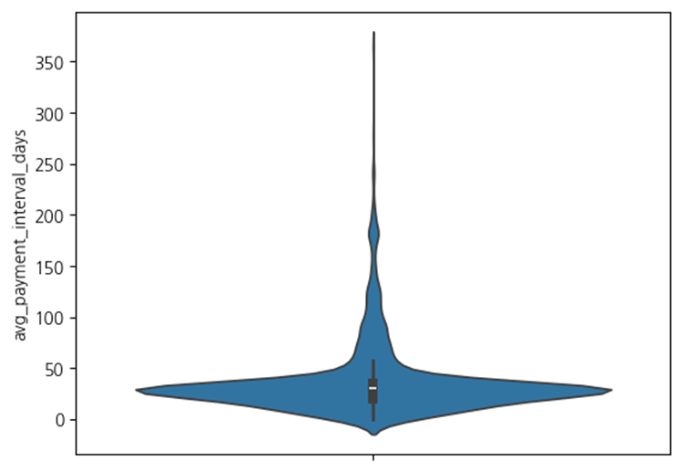 결제일 간격의 범위는 0일 ~ 412.5일이었습니다. 0일인 경우는 같은 날에 다른 구성원들의 소프트웨어를 결제한 케이스입니다.